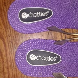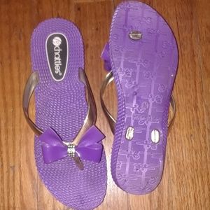 These sandals has no damage,about a 2 or 3 inch heel on it,the purple,only wore once,very pretty for girls or women size is an medium