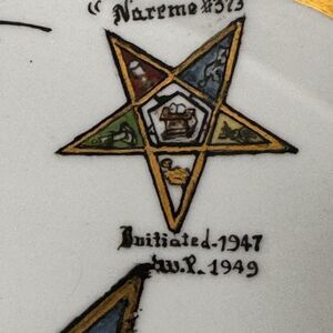 Manufacturer: Sanders Mfg Co. Design: "Order of the Eastern Star" Masonic Fraternal Organization Material: Fine Bone China with Gold Trim Size: 13 inches in diameter Large decorative plate Era: Vintage Condition: Excellent vintage condition No chips or cracks, minimal wear Uses: Collectible display plate, Masonic memorabilia, historical fraternal décor