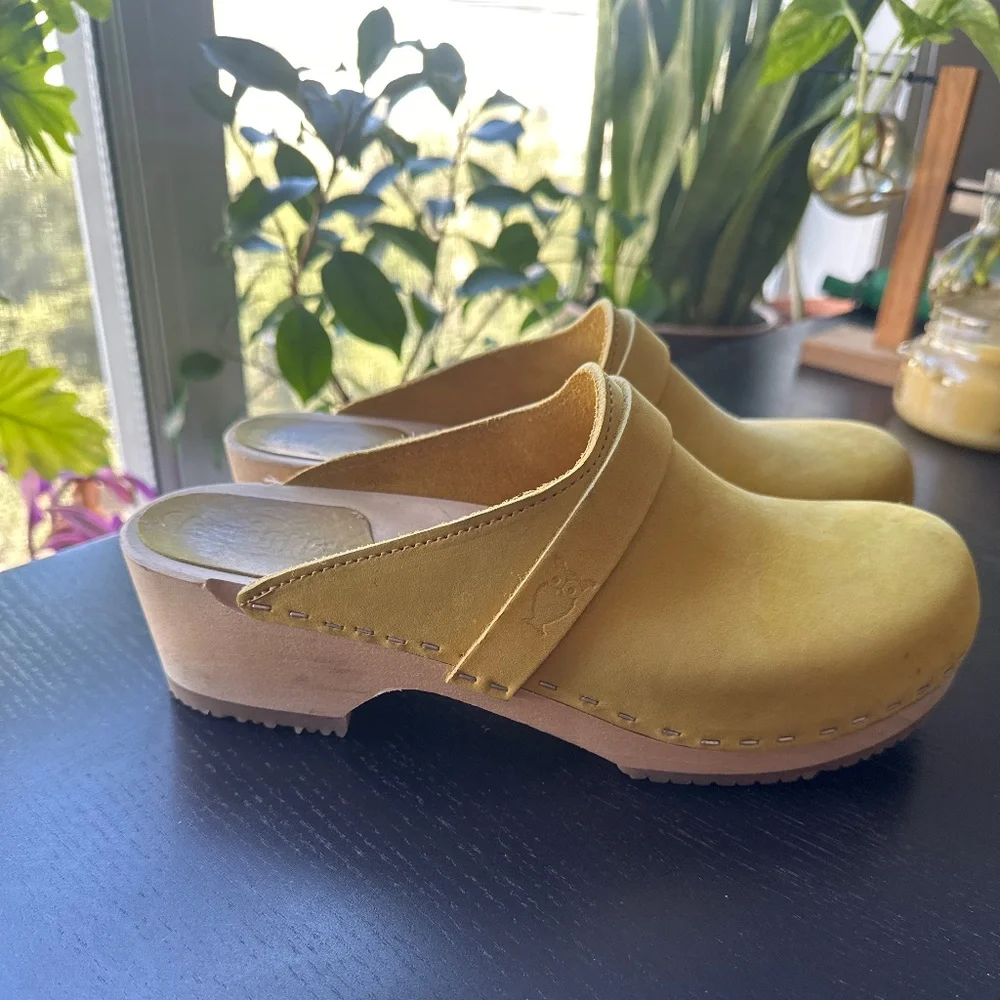 Beautiful yellow/green color. Only worn outside the house once. Sandgren clogs call this royal yellow.