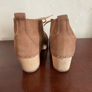 An artistic family tradition is showcased in the precise detail in the cap toe design of these clog booties. The lacquered, natural wood base adds comfort with its soft rubber sole, while the Nubuck leather further elevates the quality of this lace-up clog bootie. It is a classic style that transcends the passing trend yet remains completely of-the-moment.