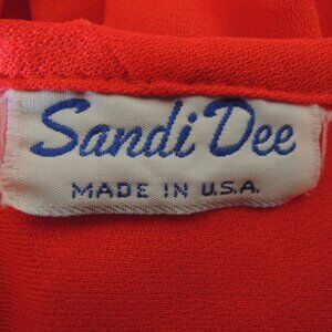 Vintage 70s Sandi Dee red & white dress with puff sleeves, size 14 or L/XL. (No size tag, please check measurements.) You can bring home the bacon, fry it up in a pan...'cause it's the 70s, and you're striding to work in this dress (and your nylons and sneakers, of course...) Vintage Made in USA dress is red with white accordion pleated inset yoke at bodice, round neck with red accent, elbow-length puff sleeves, and full gathered skirt. Elastic waist allows dress to be worn with belt or blouson style. Original red belt is missing (I styled dress with a white sash). Lightweight, flowy material (no fabric tag, feels like polyester). Ideal for costume, cosplay, or that 70s look. Elastic on sleeve cuffs is no longer very stretchy. Otherwise very good vintage condition.