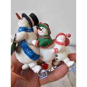 one snowman is missing his nose, stands about 4.5 in tall by 2.5 by 2 in, mamba snowman set smallest one is missing his nose as well 3 in tall by 3 in by 2 in, does have multiple marks noted on that one I love you couple is about 4 in by 3 in mild wear, overall but moderate scratches on the back comes as a set