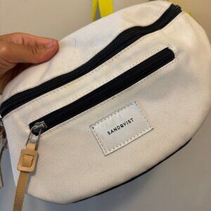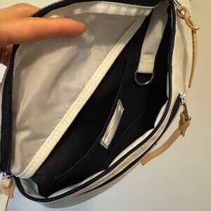 100% recycled polyester, water repellent. Shoulder strap is adjustable. Great condition, only used a small handful of times. There's a small zippered pocket on the outside and a small compartment inside the main one.