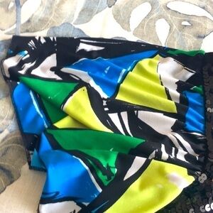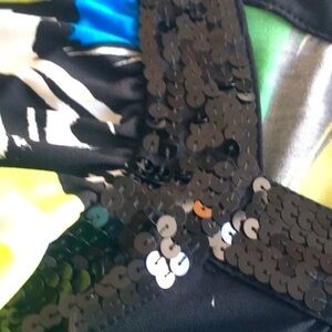 Sandra & Andre contemporary print shirt with sequin trim around the neck and sleeves. Colors are blue green lime black and white. Very cool print looks great on and is very comfy. Sleeves are flutter sleeves. Very flattering. This is a great shirt for your cruise or winter vacation. Excellent Preowned Condition. Size Medium.
