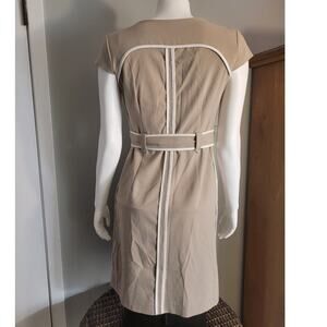 Polished Sandra Darren petite dress in tan with crisp white trim. Features a belted waist, scoop neck, short sleeves, and a structured modest fit that’s perfect for the office, church, or professional events. Knee-length with button and hidden snap closure for a secure finish. Crafted from a comfortable polyester-rayon-spandex blend with subtle stretch. Classic neutral colorway makes it versatile for layering or wearing solo. Excellent pre-owned condition with no visible flaws (note: top button missing but hidden by snap closure).