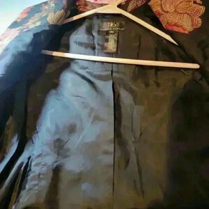 The Sandra Darren blazer is a women's suit jacket made of woven polyester fabric with a floral pattern in brown. It features long sleeves with no button, a regular jacket/coat length, and is lined with acetate. The blazer comes in size 8 and is suitable for various occasions such as work, casual, and church. It is lightweight and can be worn in all seasons. The blazer is adorned with tapestry beading and is perfect for office, festival, and special occasions.