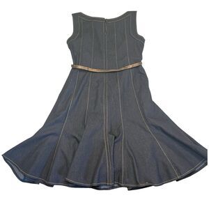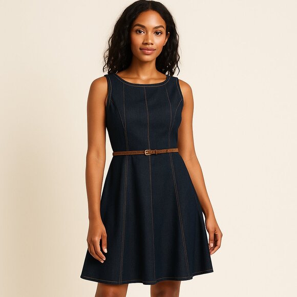 ✨ Dark denim meets polished style! This Sandra Darren dark wash denim fit & flare dress (size 4P) is new with tags and perfect for fall layering. Sleek golden stitching and a textured belt create timeless charm with a modern twist. Made in Vietnam.