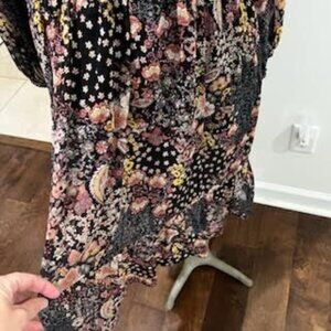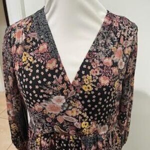 Pre-owned in excellent condition- Women's Size Medium- Sandra Darren Midi Black Floral Long Sleeve Dress. This dress is fully lined with shear sleeves and featuring a surplice V-shaped neckline, tiered body and ruffle at hem, gold shiny threading throughout. Perfect for all fall and winter occasions. Pair with flats, clogs, heels or boots. Measures laying flat at approximately 35" length, 20" pit to pit, 20" waist, 19" sleeve length.