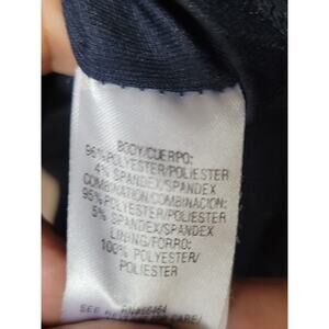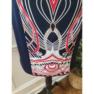 Sandra Darren women’s dress in size 12 blends bold design with a flattering silhouette. Crafted in navy blue with striking red and white geometric patterns, this sheath-style dress is fully lined for comfort and structure. Perfect for career wear, cocktail events, or evening gatherings, it offers stretch fabric for a polished yet comfortable fit.