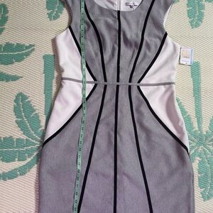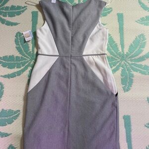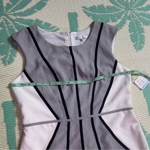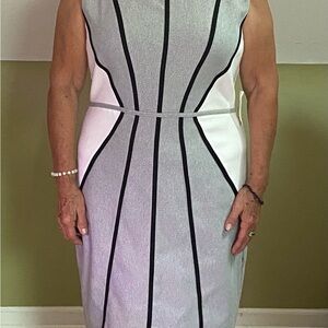 Chic midi dress with gray and white panels. Black accent lines add elegance. Perfect for any occasion.