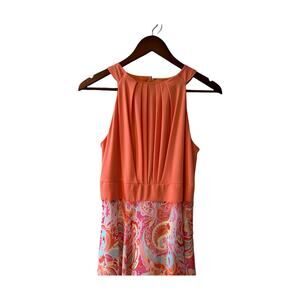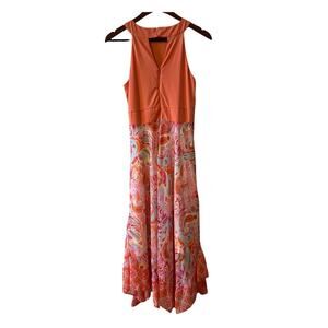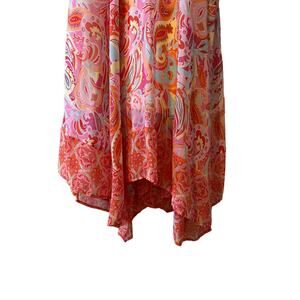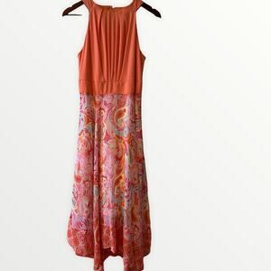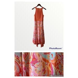 Sandra Darren melon pink turquoise paisley handkerchief hem maxi dress. Good preowned condition, marked a 10, but fits more like a M. Tiny spot noted and photographed. Pretty halter neckline, scarf handkerchief hemline, lined, poly spandex blend. Gorgeous colors!