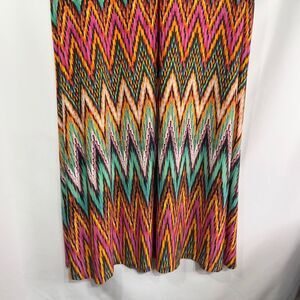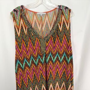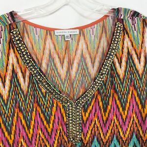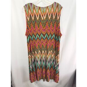 Sandra Darren 22W dress, plus size chevron dress, colorful boho dress, sleeveless summer dress, Sandra Darren women’s dress, multicolor tribal print dress, embellished neckline dress, flowy plus size dress, vibrant patterned dress, sleeveless casual dress, plus size festival outfit, lightweight bohemian dress, Sandra Darren size 22W, bold print sleeveless dress, colorful plus size maxi dress.