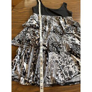 Sandra Darren black white sleeveless dress size 6. Has scoop neck. 3 layered tiers on bottom. Top is solid. Bottom has paisley print. Good pre-owned condition.