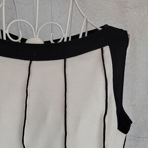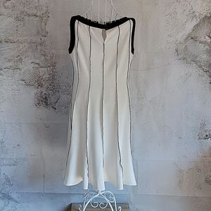 Cut in an a-line silhouette, Sandra Darren sleeveless midi dress is your go-to upscale casual with its striped black bias seam accents, boat neckline in black, and a full flowy skirt. Good pre-owned condition with normal signs of wash and wear, including some minor piling.
