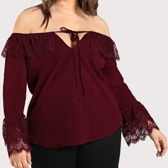 Elegant flounce lace sleeve top with tie detail. Off the shoulder cut perfect for a day shopping or night out!
