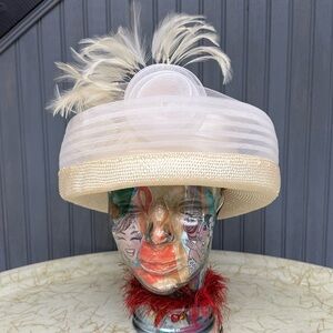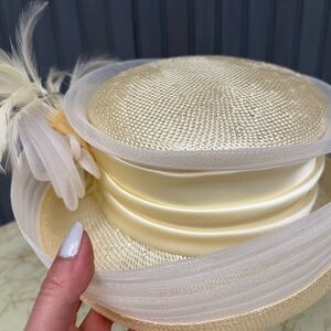 Sandra New York hat, ivory church hat, Kentucky Derby hat, wedding guest hat, feather embellished hat, women’s dress hat, elegant garden party hat, special occasion hat, organza church hat, vintage-inspired hat, bridal shower hat, formal straw hat, statement fashion hat, women’s spring hat, mother of the bride hat