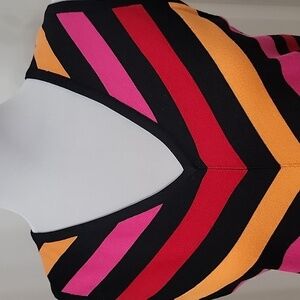 Sandra Size M Silk Blend Bright V Stripe Sleeveless Knit Top, Exc. Used Cond. No Holes, Rips, Stains or Snags. Adorable Black Knit with Pink, Orange and Red V-Stripe Pattern. V Neck. Please refer to measurements in photos to ensure proper fit. Shown on size 4-6 Mannequin.