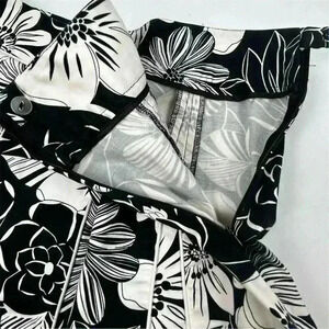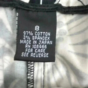 This Sandra A-Line skirt is a vintage piece crafted in Japan. It features a knee-length design in a regular size 8, suitable for women. The skirt is black with a floral pattern and is made from a blend of cotton and spandex, offering comfort and a slight stretch. The item is pre-owned.