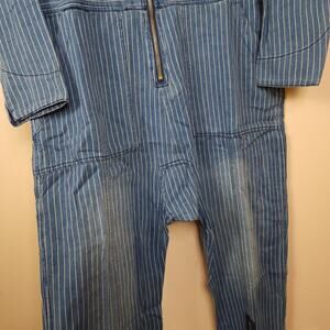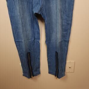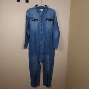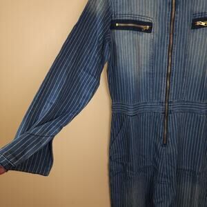 100% cotton fabric with edgy gold zippered accents make this vintage inspired jumpsuit from Sandrine Rose a unique and fun piece for your wardrobe. Two front and two back pockets. Pull on styling with front zipper closure. Zipper accent on legs and two zipper closure pockets on chest. This is in size Medium and is new with tags attached. The fabric is lightweight and soft. Pinstripes on the indigo blue fabric add extra style.