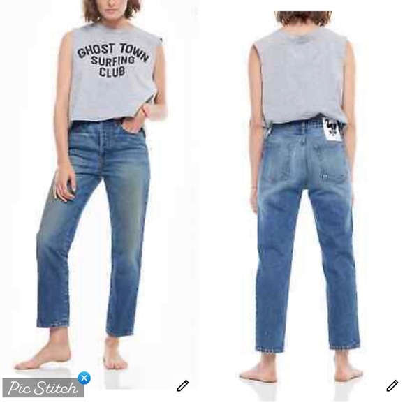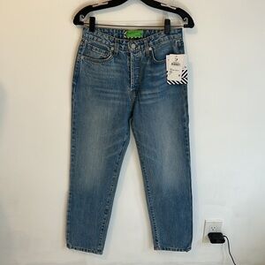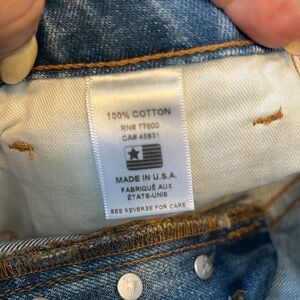 Medium wash with intentional fading and whiskering. Distressed rear pockets. Non stretch denim. Belt loops and five pocket styling. Button fly. NWT