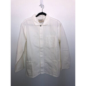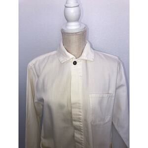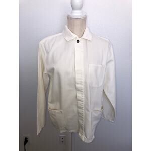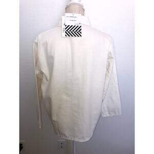This button-down utility shirt jacket is intended to have a boxy oversized fit and utility feel. It is perfect for transitioning in the seasons and layering. It features one breast pocket and two pockets by the front of the hips. It is minimalist in style but is functional and a perfect closet staple. The collar and hidden front buttons add to the sleek minimal design. New with tags, no damage.