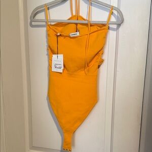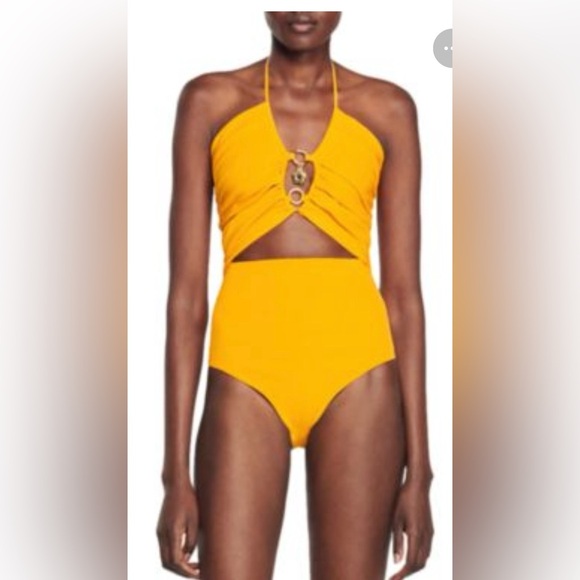 Stylish yellow swimsuit with a chic cutout design. Features a unique ring detail at the front. By 3