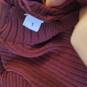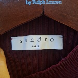 Sandro Ange womens dress. Knit. A-line. Short scalloped sleeves. Wine. Above knee. Ruffle around waist. Contrasting patterns. Fitted with stretch. Mock neck. Size 1 or US 4 Pit to pit flat lay 11.5" length from collar to hem 37" measurements are approximate