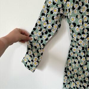 Features: green, daisy, floral, yellow, Printed, Linen-blend Ruched, Buttoned cuffs, Partially elasticated waistband Slips on