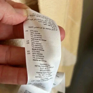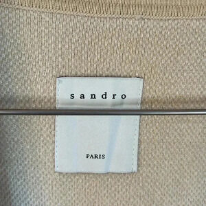 Chic Sandro cardigan with diamond pattern. Soft beige and white tones. Open front style. Ideal for layering.