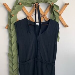 In good condition with no visible flaws. Solid black jumpsuit with halter neckline. Snap buttons in the front, elastic waistband. Lightweight flowy material. Sandro size 1 is equivalent to a US small.