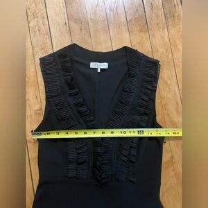 No size on this dress, but I would call this an XS based on measurements, so please take a look at the pictures. From Sandro Paris, black mini dress with a ruffled v-neckline and sleeveless. Perfect cocktail attire and great quality and condition.