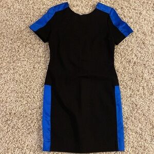 Stylish black bodycon dress with striking blue accents. Perfect for a night out.
