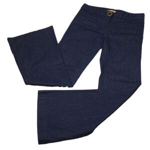 Sandro Vintage Women's Tall Blue Dark Wash Mid Rise Gold Accent Button Zipper Front Closure Wide Flare Leg Dress Casual Bohemian Denim Trouser Pant. 98.2% Cotton, 1.8% Elastane. Two Faux Front Pockets. Two Faux Back Pockets. Belt Loops. Loose Faux Back Pockets Thread. Measurements approx. Waist: 15, Rise: 9, Hips: 17, Inseam: 32, Hem Opening: 11". Size 38 Tall/US 6 Color May Vary Due To Lighting.