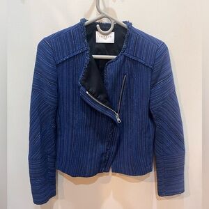 Sandro asymmetrical quilted blue jacket. A great spring and fall jacket. Comfortable and stylish. Lining is 100% cotton. Size 36. Excellent condition - no rips or stains