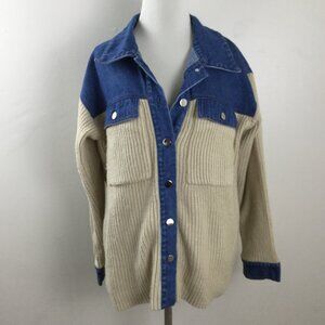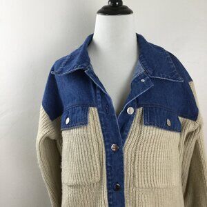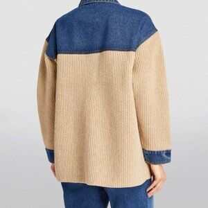 Stylish Sandro jacket with denim and knit design. Features blue denim top and tan knit sleeves. Button closure for a chic look.