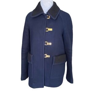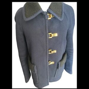 Sandro coat, well loved but the outside looks amazing, navy-blue with black wool collar and pocket. Fastening with golden hooks. The inside has a quilted polyester lining, that does have damage. Please see all pictures. Comes from a smoke free home- price reflects damage, but I do accept reasonable offers