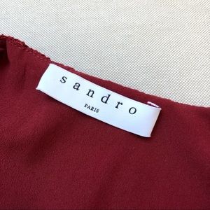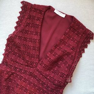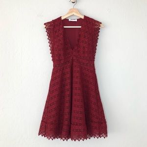 Beautiful burgundy red lace dress with delicate lace edges and a sheer waist. V-neckline, fitted bodice and flare skater hem, zipper closure, lined. Sandro size 1 / US Small.