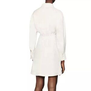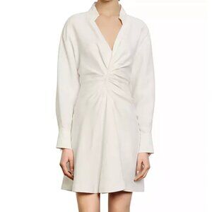 Features: v-neck with collar, invisible zipper closure at side, long sleeves with button cuffs, ruching at chest, straight cut, unlined, linen blend material