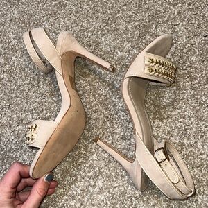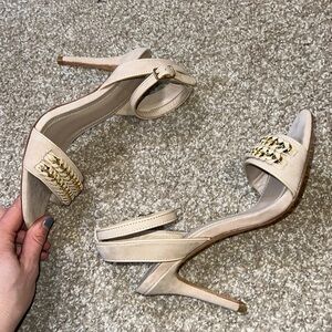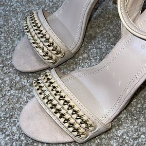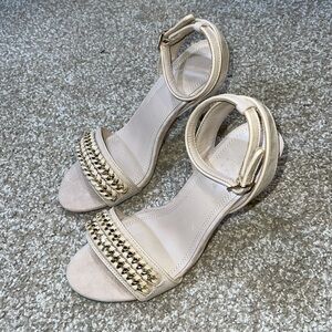 The perfect node heel doesn’t exi—oh wait! These cuties come with a cute little golden touch. High quality heels from Sandro Paris! From the website: Goatskin suede sandals with slender heels