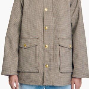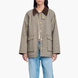 Quilted checked coat with contrasting velvet collar and placket, zip fastening with button placket and side pockets.