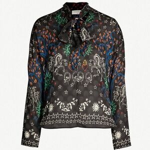 Self-tie at neckline, frilled trim at neckline, long sleeves, buttoned cuffs, all-over conversational print, curved hem