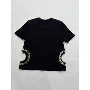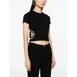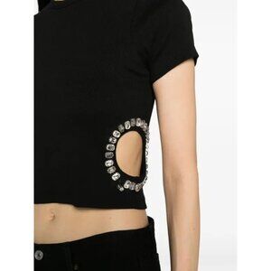 Description from retailer: black cotton jersey knit crystal embellishment cut-out detailing ribbed detailing round neck short sleeves cropped straight hem