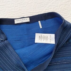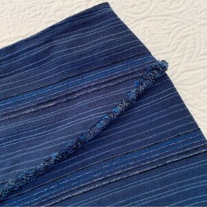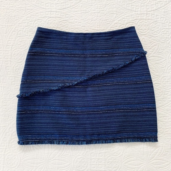 Mini skirt with asymmetrical fringe accent and fringe along bottom hem. Textured blue color.