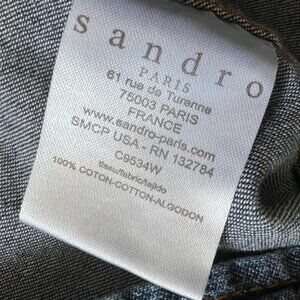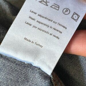 Luxury brand denim button-up shirt with pearl snap buttons. Features two chest pockets and long sleeves. 100% cotton