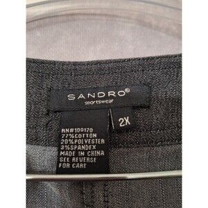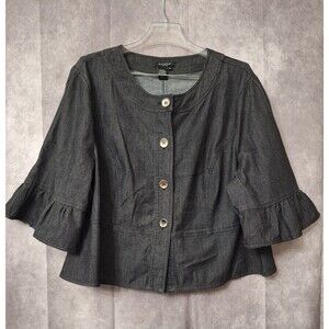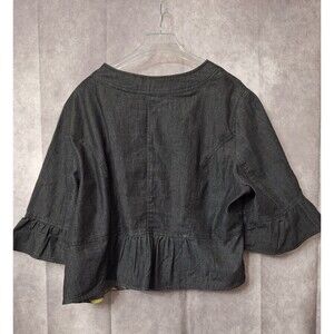 The Sandro Denim Chambray Peplum Jacket in women's plus size 2x offers a stylish and versatile option for various occasions. Made from a comfortable cotton blend denim fabric, this jacket features a ruffle and button accents, adding a touch of boho chic to your outfit. With a collarless design and lightweight construction, this jacket is perfect for all seasons and can be easily styled for casual wear or even a party. The jacket's breathable material and stretch fit ensure a comfortable and flattering look for any fashion-forward woman looking to add a trendy piece to their wardrobe. Excellent pre-owned condition. PTP 26 in. Length 23.5 in.
