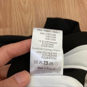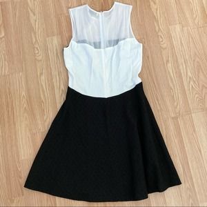 Sandro Paris black and whole cocktail dress with white mesh paneling.