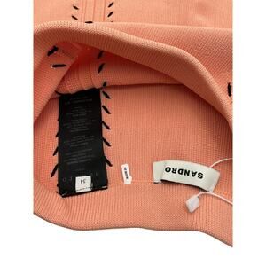 Sandro 'Eglantine' Pink Knit A-Line Skirt Size 34: pull-on, high waisted, black stitching detail, knit mini skater skirt, measurements: 11 inch width x 18.5 inch length.