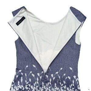 Sleeveless midi, length dress blue with white floral pattern and skirt