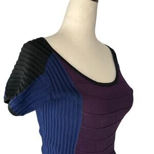 Keywords: Sandro Colorblock Cotton Knit Dress, Mini, Scoop neck, Pull Over, Slips On, Summer, Short Sleeve, 100, Cotton, Spring, Purple, Blue, Fitted, Fit and Flare, A line, Professional, Office, Career, Modest, Bold, Dark Academia, Flattering, Flare Dress, Multicolor,