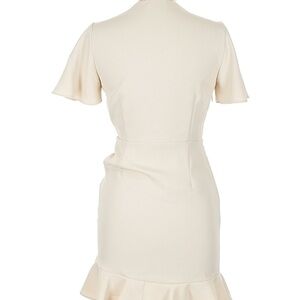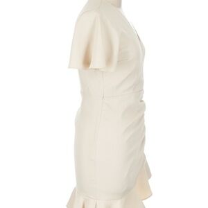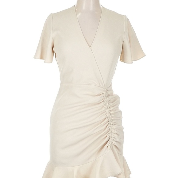A flattering cream wrap dress with ruched side detailing. Short flutter sleeves add a feminine touch. Lightweight fabric provides comfortable all-day wear. Perfect for events or polished daytime looks.